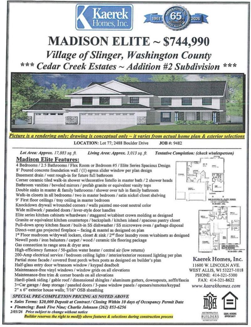 This single family home located at 2488 Boulder Drive, Slinger, WI 53086 is currently listed for sale with an asking price of $744,990. This property was built in 2026 and has 4 bedrooms with 3013 sq. ft. Boulder Drive is located in the CEDAR CREEK ESTATES subdivision within the Slinger school district. Search CEDAR CREEK ESTATES real estate on wendyhill.starkhomes.com today.
